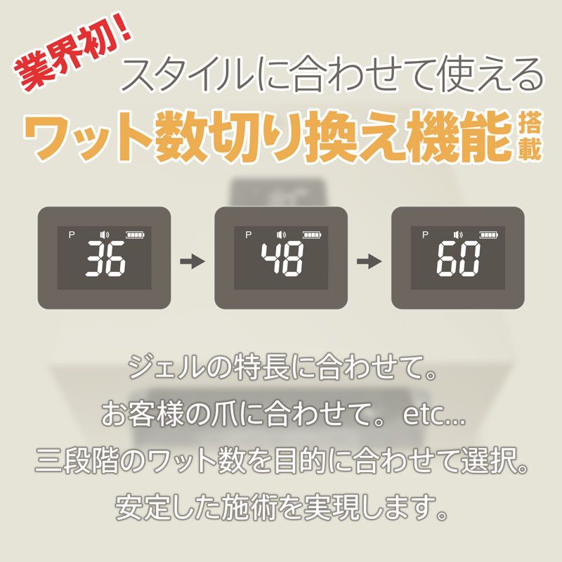 使用しているジェルの特徴やネイリストの施術スタイルに合わせて、36W・48W・60Wの3つの出カワット数を切り替えることで、安定した硬化が可能です。(ワット数や使用するジェルにより硬化熱も変わりますので、事前にテストをしてからご使用ください。)