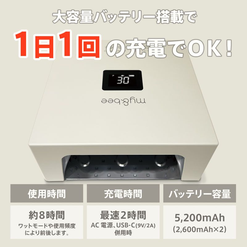 コードレスなのに1日1回の充電で使用可能な大容量バッテリー内蔵のUV/LEDハイブリッドライト。ジェルに合わせたワット数に切り替えることができるなど様々な機能はより快適なサロンワークを実現してくれます。