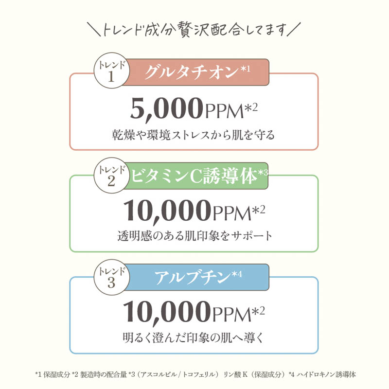 2種のリポソーム、グルタチオン*1、ビタミンC誘導体*2を配合し、白玉ケア*3に。