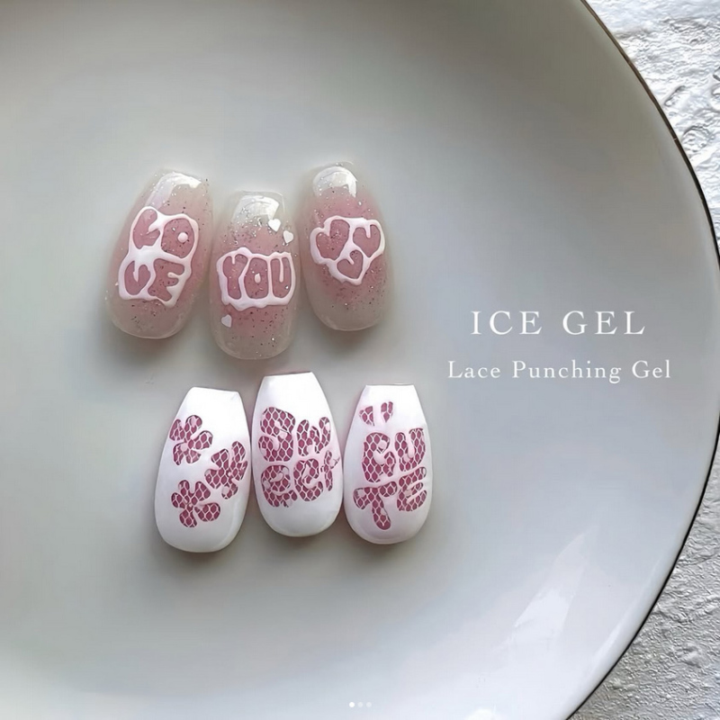 専用のレースパンチングベースジェルを塗布&硬化後、レースパンチングカラージェルを一塗りし、ドット棒を使い文字や絵柄をくり抜きます。