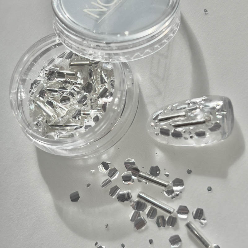 ミックスされたパーツとホロを埋め尽くしとして使用すると、奥行きと輝きがさらに際立ち、華やかでラグジュアリーな印象に仕上がります。