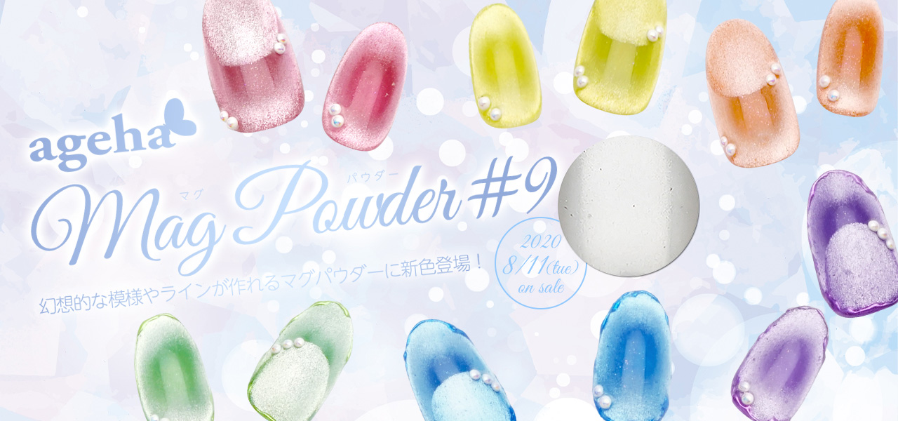 ※カラージェル(シアー・クリア系)とMAGパウダー#9を2:1で混ぜ合わせ、お好みでクリアジェル(agehaグラデーションクリアジェル等)で調整してご使用いただくことでMAGパウダー#1-8とは違った表現をすることができます。