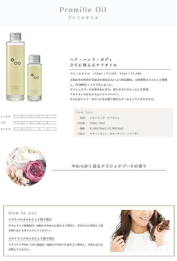 2.プロミルオイルを3-4滴手のひらに出し、よく伸ばす。