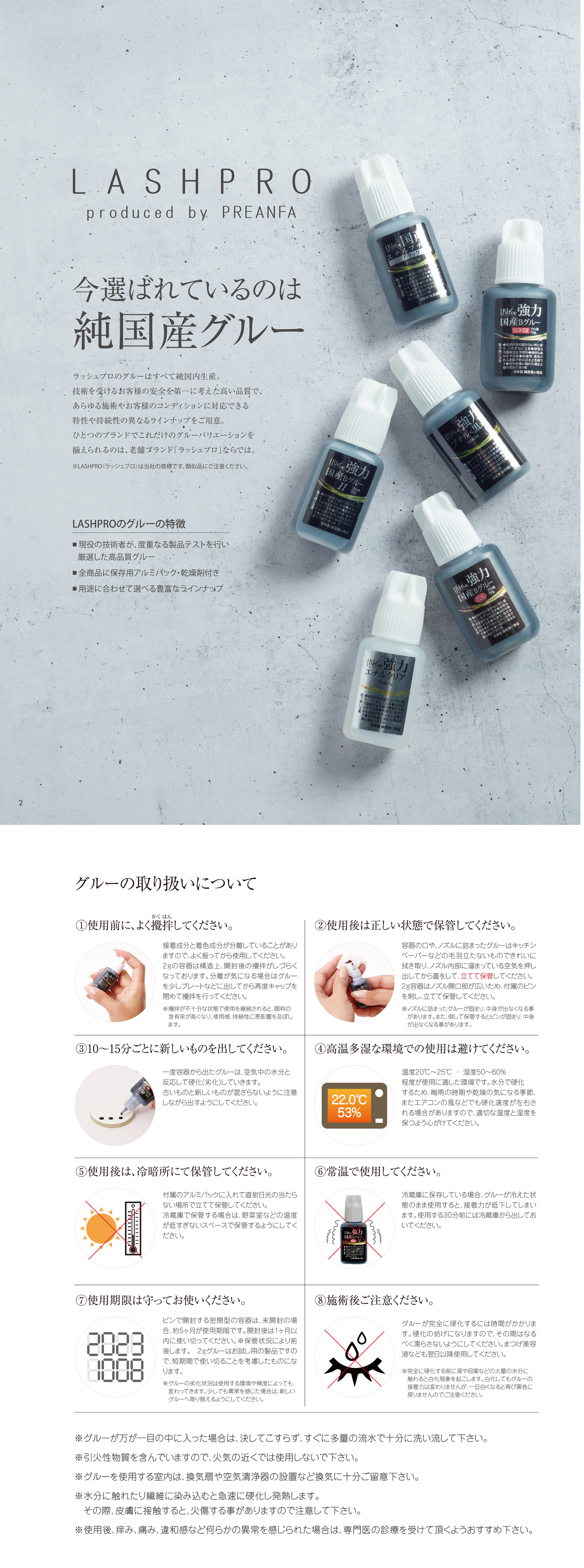 ※まつ毛エクステ用グルーは原材料にシアノアクリレート系接着剤を使用しています。使用時にアレルギー反応を引き起こすおそれがあります。本製品を初めて使用される方は、パッチテストを行うことをお勧めします。