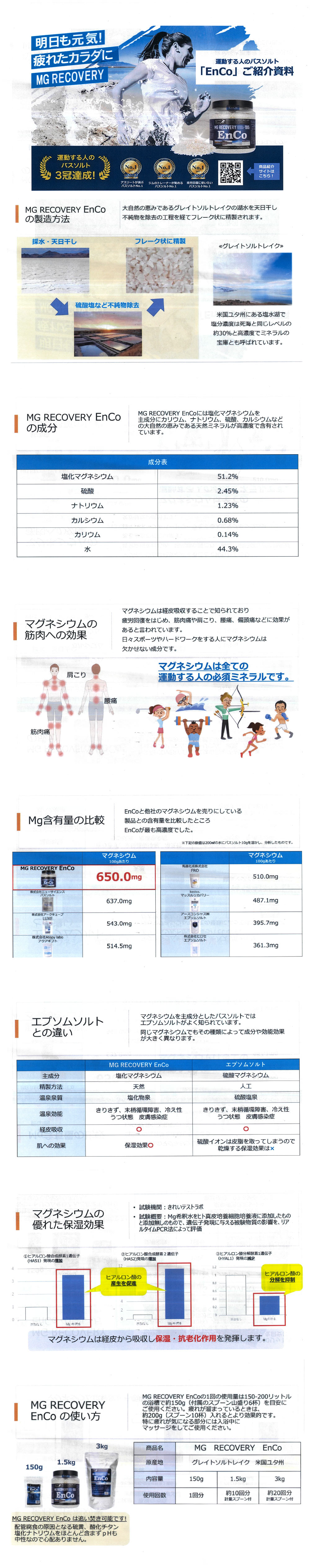 EnCoには塩化マグネシウムを主成分にカリウム、ナトリウム、硫酸、カルシウムなどの大自然の恵みである天然ミネラルが高濃度で含有されています。