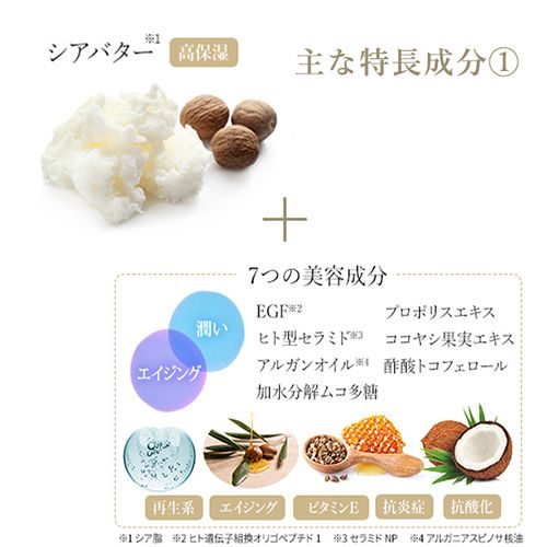 EGF、ヒト型セラミド、アルガンオイル、加水分解ムコ多糖、プロポリスエキス、ココヤシ果実エキス、酢酸トコフェロール