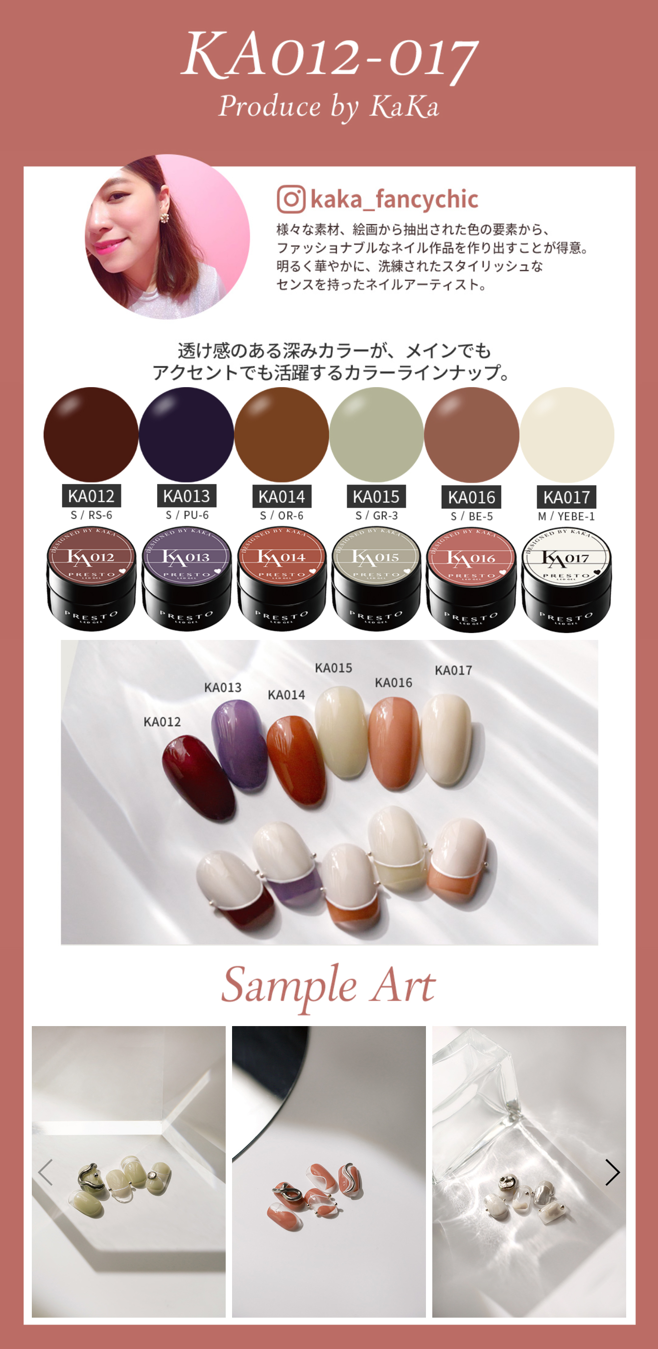 透け感のある深みカラーが、メインでもアクセントでも活躍するカラーラインナップ。※KA017のみマットカラー