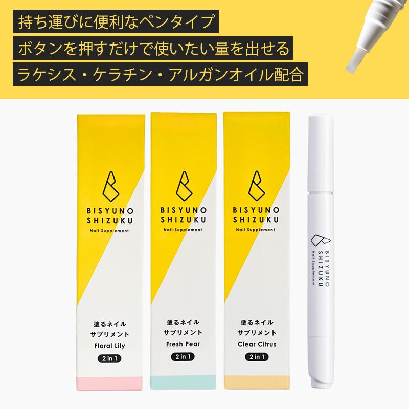 「美手の雫ネイルサプリメント2in1」から待望の香り付き商品がペンタイプで登場♪Ag+※1配合で、爪・爪周りをすこやかに保ち、爪に潤いを与えて保護する「ラケシス」※2「ケラチン」※3、爪・爪周りに潤いを与える「アルガンオイル(アルガニアスピノサ核油」※3も配合。毎日のケアで爪を土台から美しく保ちます。