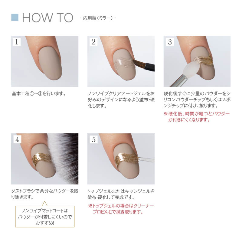 硬化後はベルベットのような質感で、パウダーの付着が少ないため、ミラーアートの下地にも最適です。