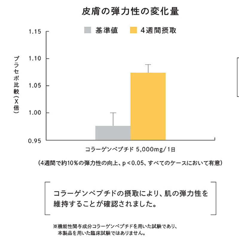 摂取開始前、摂取4 週間後に、皮膚の弾力性などを客観的に測定。コラーゲンペプチドを摂取した両グループでは、プラセボ群と比較して皮膚の弾力性に有意な差が確認されました。