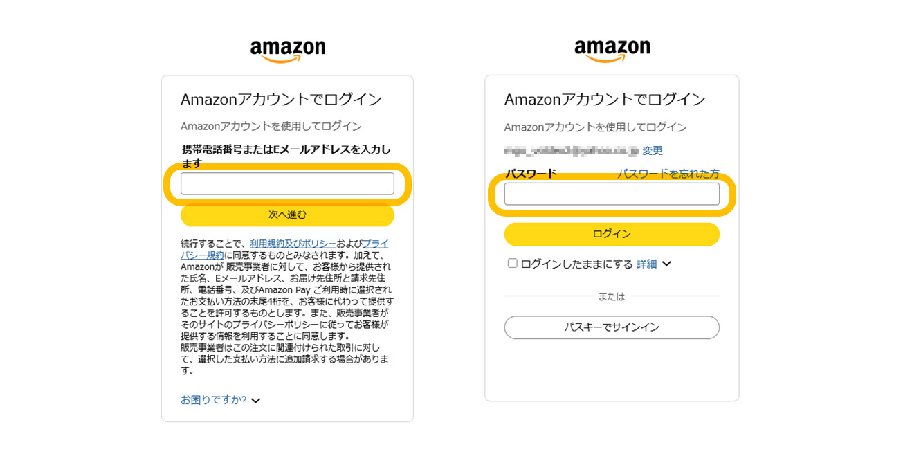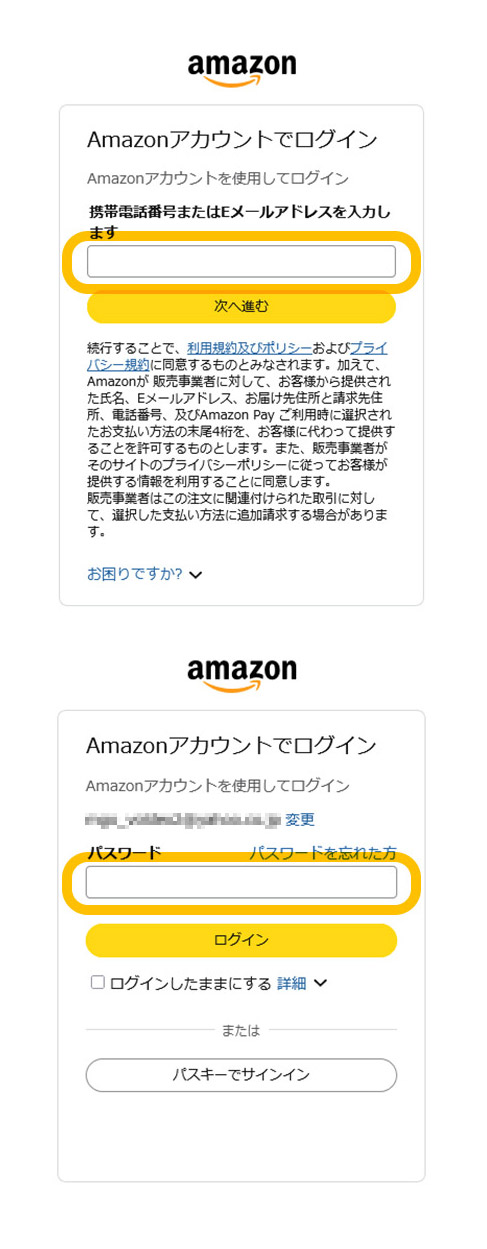 Amazonの本人認証画面で、登録の メールアドレス と パスワード でログイン