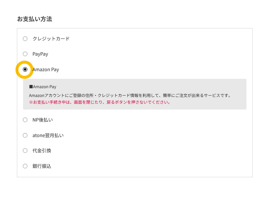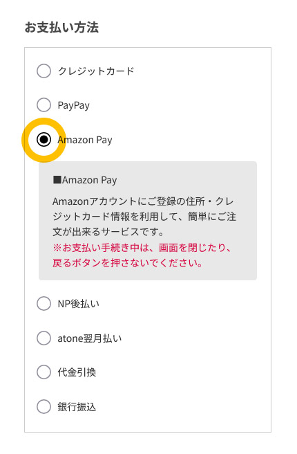 カート画面からレジに進み、お支払い方法で 【Amazon Pay】 を選択