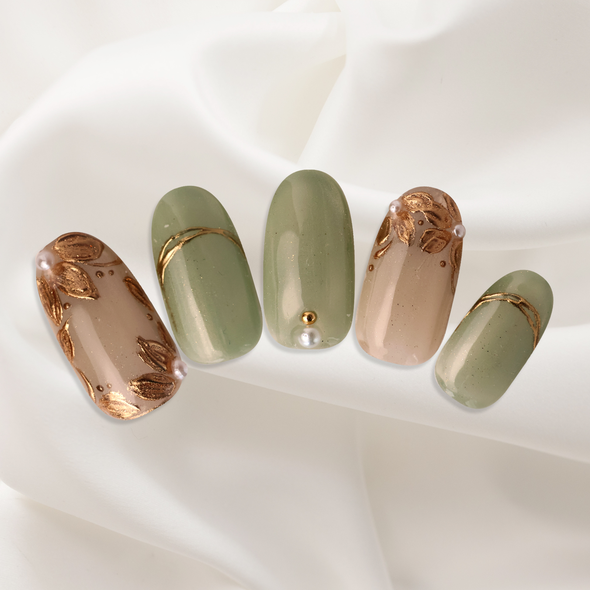 やわらかなグリーンと上品なゴールドが織りなす、春らしい軽やかなデザイン。さりげないリーフアートが指先に優しい彩りを添えます