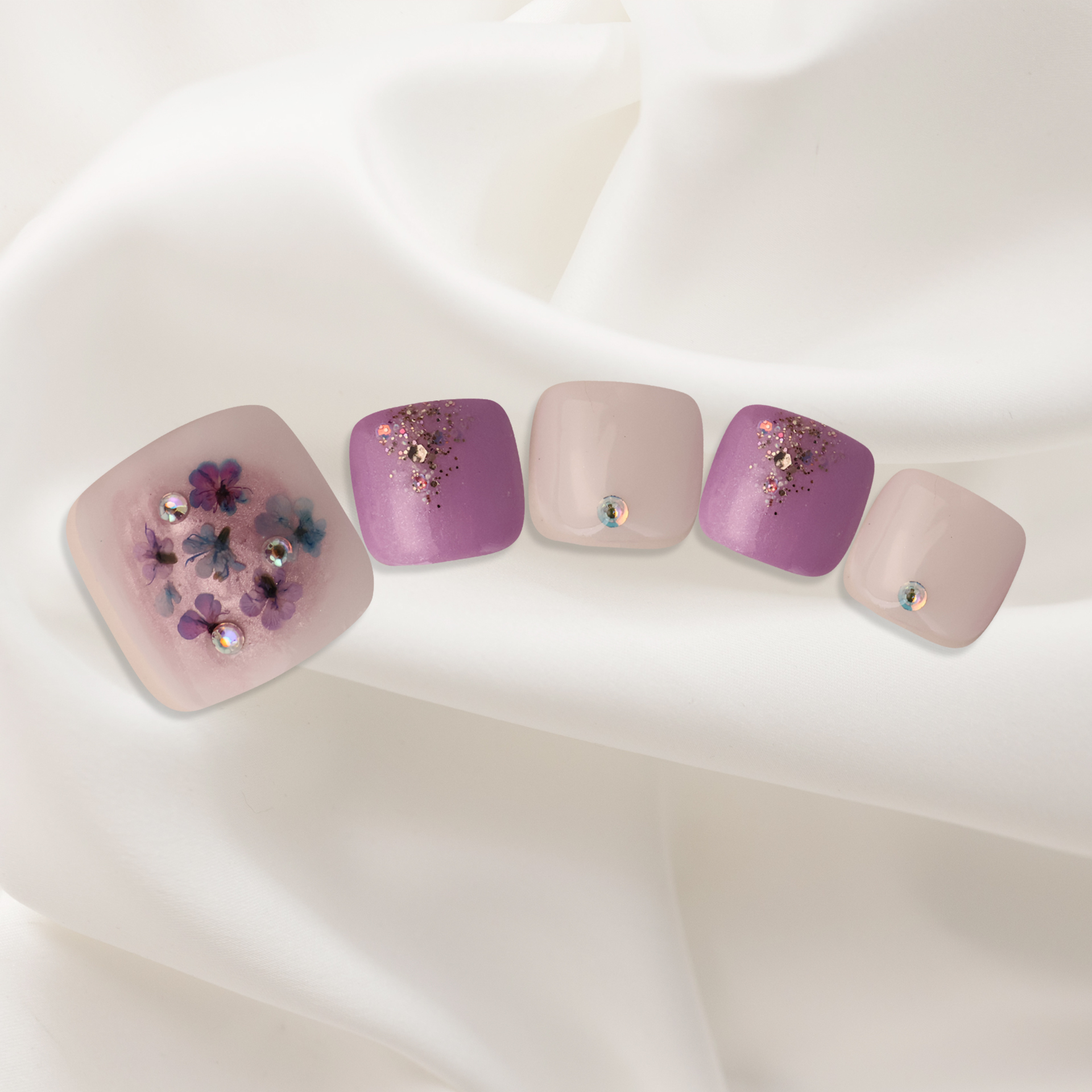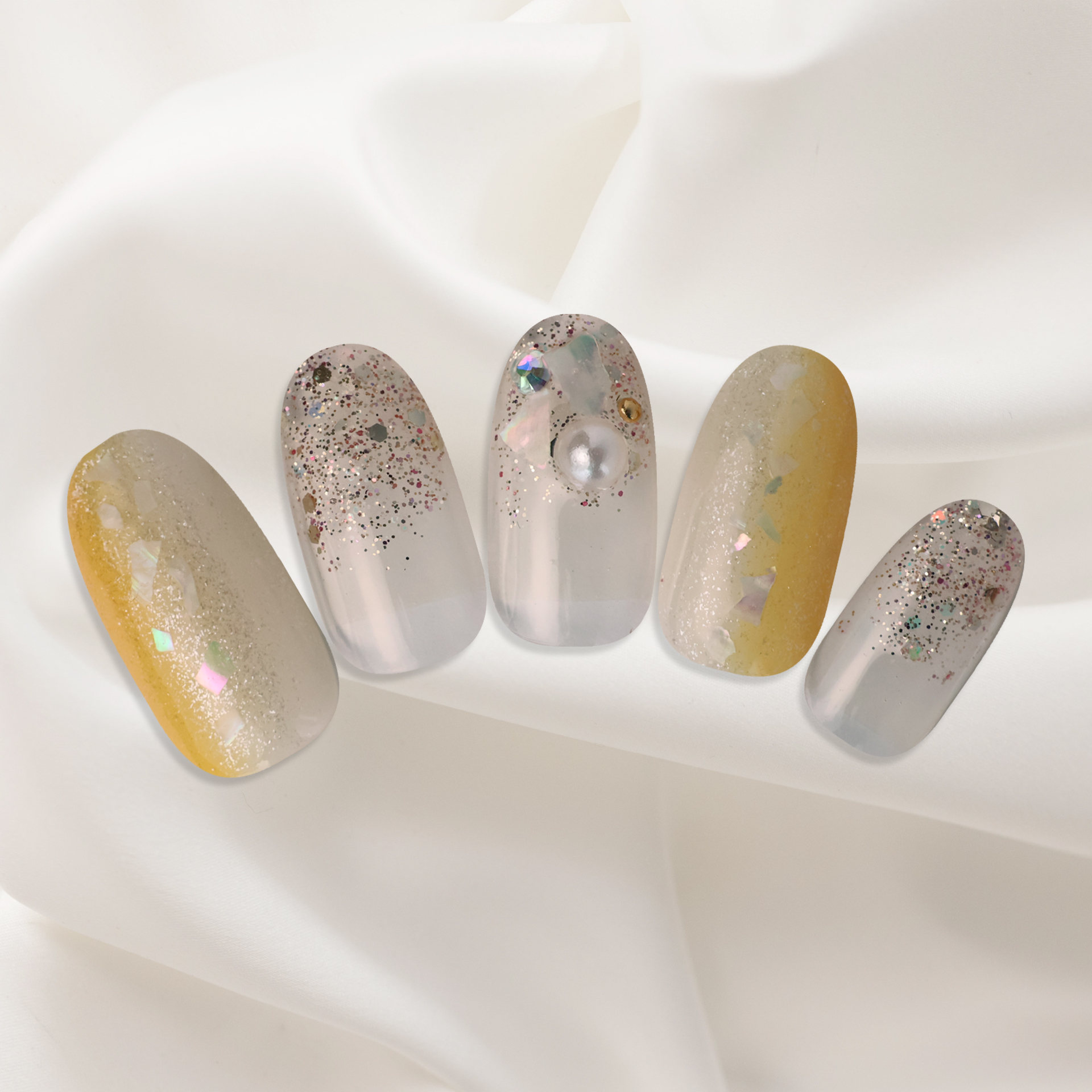 淡いブルーとピンクを基調とし、シルバーグリッターがきらめく、夢幻的でエーテルのようなデザインです。