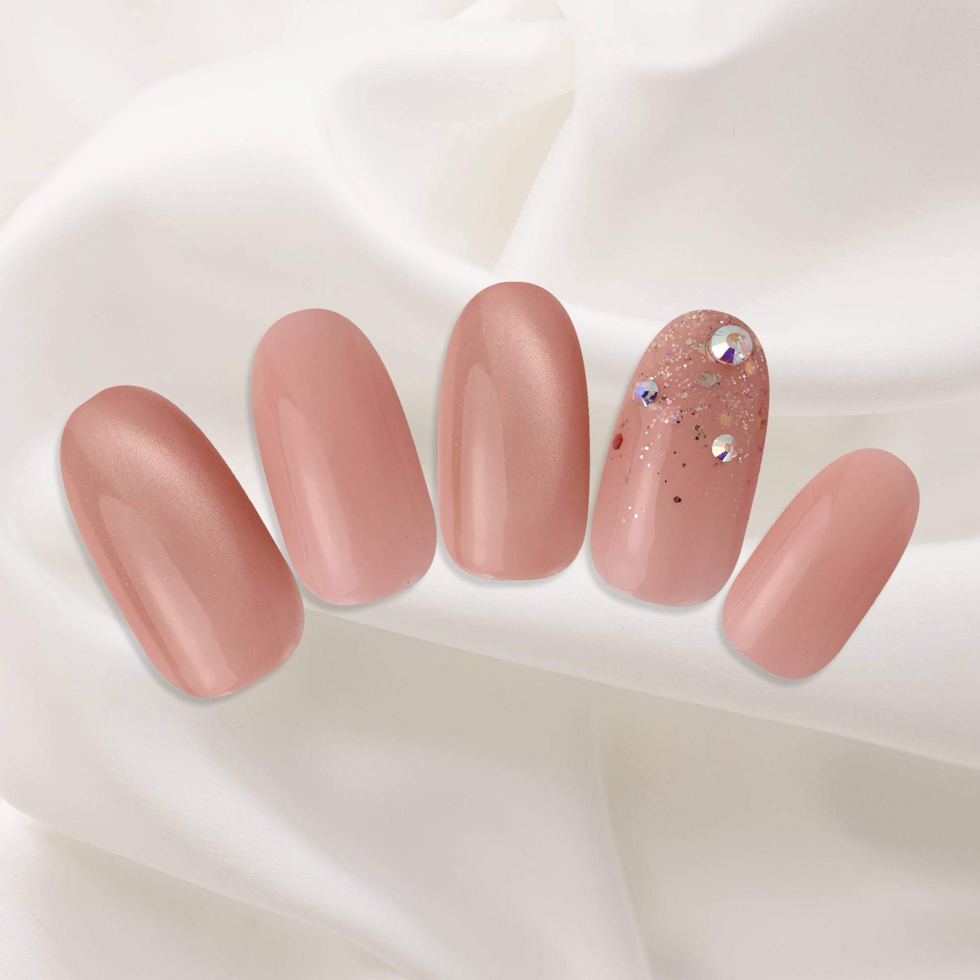 ヌードカラーの肌なじみの良い落ち着いたカラー。中指にはストーンを添え、シンプルながらも上品なアクセントをプラスしています。