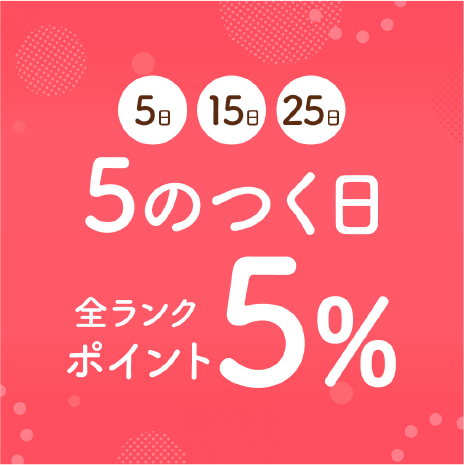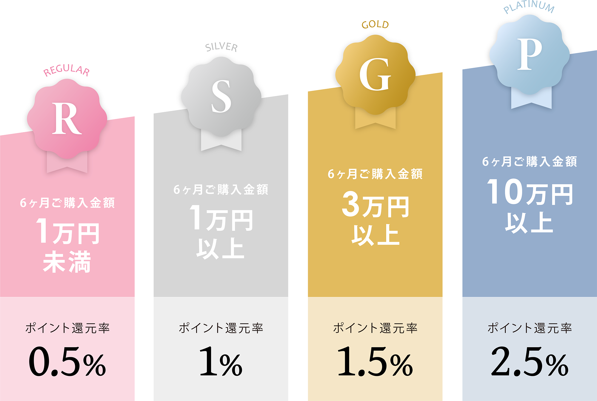 「レギュラー」「シルバー」「ゴールド」「プラチナ」の4 つのランクに分かれていて、最初はレギュラーからスタートし、6 ヶ月のご購入合計金額によって、ランクが変動します(毎月1 日に自動更新) ランクが上がるほど、ポイント還元率がUP ! 毎月ポイントアップキャンペーンも実施しています♪ |